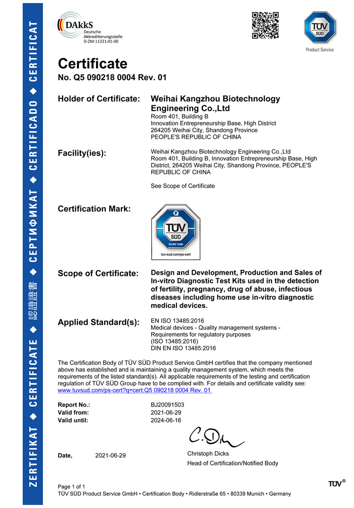 ? ? ?威??抵萆锕こ逃邢薰境闪⒂?013年,公司坐落于風景秀麗的海濱小城——威海市。康州生物是集研發、生產和銷售于一體的生物科技公司,與威海哈爾濱工業大學合作研發團隊,擁有先進的科研基地及生產基地。主要從事快速診斷檢測產品的研發、生產、銷售。產品涵蓋:生育檢測、藥物濫用檢測、農藥殘留檢測以及其他臨床診斷檢測等。公司自主研發生產得早早孕試紙,排卵檢測試紙,毒品檢測及疾病檢測等醫用產品,經過歐盟認證,產品質量穩定,值得信賴。